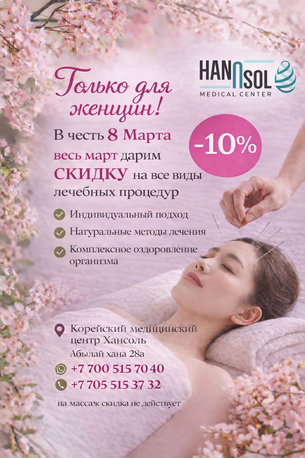 В честь 8 Марта весь март скидка 10% на все виды лечебных процедур.
